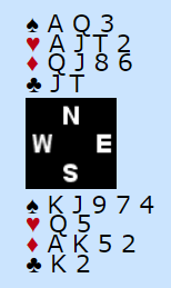 La oss si du tar de fire store trumfene og gir bort til nords femte ruter (det gjorde han mot meg). Underveis på alle trumfene har syd kastet flere kløvere, og det så ut som han la styrkekast selv om du kanskje ikke kan stole helt på det, og han kastet også en hjerter. Du vet at ingen kaster unna hjerter fra firekorts farge med den hjerteren hos blindemann, og vest har vist esset.
