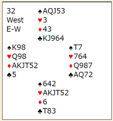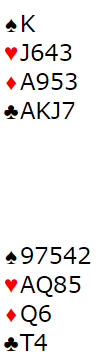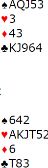 Dette utgangen burde vel være ganske enkelt å vinne på flere måter for mange, og ikke det aller mest spektakulære vi har sett fra den kanten, men det skjedde annerledes enn spillet gikk ved de fleste bordene. Og nesten halvparten av N/S-parene gikk bet, noen av dem bet i 3 hjerter (!), og enkelte gikk to bet i 4 hjerter (for eks. de bommet trumfen med esset først, og bommet også kløveren).