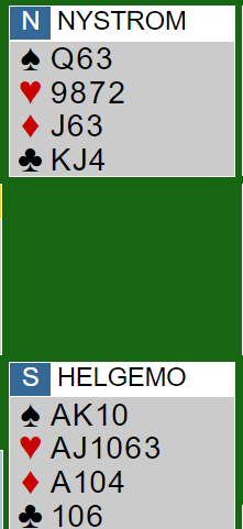 Nok en gang stoppet det svenske N/S-paret i 3 hjerter mot Grude-Bakke, etter at vest hadde åpnet med 1 ruter. Og nok en gang meldte det norske parets lagkamerater utgang ved det andre bordet. De var i 4 hjerter. Å spille 4 spar ser ikke så dumt ut, men 4 hjerter kan godt være like bra med disse kortene, for eksempel hvis sparfargen sitter skjevt.