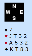 Om ikke hjerter var meldt av vest kunne hjerterutspill vært et alternativ. Siden du vet det er femkorts farge i hjerter (noen få steder kun minst fire hjerter) må det velges mellom et offensivt utspill i en minorfarge, eller trumfutspill. Selv hater jeg trumfutspill med singelton. Dermed er kanskje kløverutspill det beste? Det er uansett et skudd i mørket, alt kan blir feil, alt kan bli riktig.