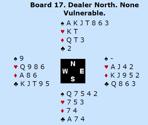 De som spilte ut trumf eller hjerter måtte notere utgang til Ø/V. De fleste av de som spilte kløver ut fikk tak i fire stikk. Noen dyttet imidlertid på 4 spar likevel da nord fortsatte med kløver i andre stikk, og syd kom inn på kongen. Da bør han nok spille ruter ess. Nord legger kongen for å fortelle om KQ, og syd fortsetter med ruter - en bet. Men noen "glemte" å cashe ruter ess, for de tenkte kanskje det var god sjanse med en tredje runde kløver for å forfremme nords trumf. Det var det ikke, i stedet ble det pådyttet utgang.