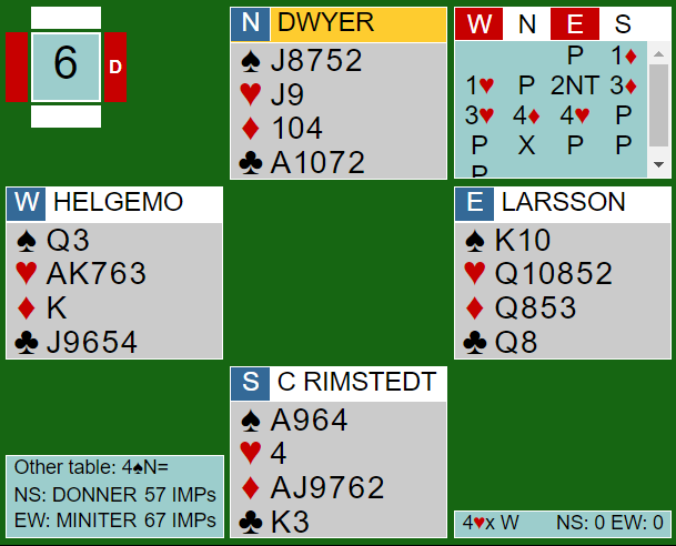 Mer normalt meldt av nord, og Clementsson-Nystrøm skulle altså spille 4 spar med førstnevnte som spillefører. Hun hadde ingen nevneverdige problemer i den kontrakten og tapte ett stikk i hver av fargene spar, hjerter og ruter. Med meldt og vunnet utgang i begge retninger (!), +420 ved det bordet og +590 ved det andre ga spillet 15 IMP til MINITER.