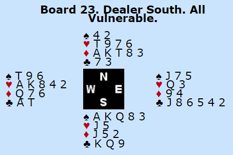 I spillet etter den dramatiske 1 hjerteren doblet vurderte Clmentsson og Nystrøm bedre enn N/S ved det andre bordet, men de var litt heldige og kan man si. Unge Sanna Clementsson satt med: