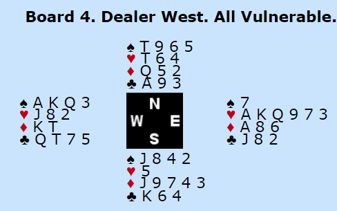 3 andre par spilte med Vest som spillefører men av Vest, og da Tom Gjøs fant utspill kl 3 kunne Ove Gundersen i Syd innkassere to stikk direkte så Gunnar Pettersen var bet allerede. Og vanskelig å gjette trumfsitsen førte til at finesse ikke ble valgt og 2 bet notert. Det samme skjedde der Lars Helgesen som Vest fikk kl 3 ut mot 6 ruter fra Tom Gjøs Tone Annette var heldigere i 5 ruter av Vest, fikk liten hjerter ut og fikk saket begge kløverne i bordet, dermed 12 stikk, tapt til ru K som eneste.