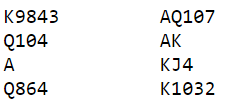 Slem er ikke opplagt, spesielt ikke om øst er spillefører. Det kan være en autobet om kløver sitter 4-1 og de får tak i kløver ess og en kløver til stjeling med det samme. Det er ett avkast i hver rød farge, men på hver side, så om det ikke kommer kløver ut vil de bli et valg hvilken vei kløveren bør spilles siden det blir igjen tre kort i kløver på hver side. Hvem har knekten? Tja, hvem vet...