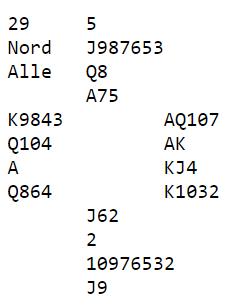 Vinnerparet satt N/S mot 3NT hvor det ble tolv stikk. Det ga litt under middels til vinnerparet da +690 til Ø/V slo en rekke med +680, og noen som fikk kun +650 etter å ha bommet kløveren i 4 spar. Ett Ø/V-par "went over board" som en sier på veldig dårlig norsk, de spilte 7 spar med en bet (doblet!).