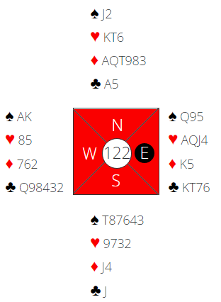 I dette spillet avhenger mye av hvordan meldingene går. Hvis Ø/V bruker svake grander (12-14) kan det bli trist denne gangen, for da vil nord få muligheten til å melde inn med ruterfargen sin. Også hvis vest etter sterk 1NT fra øst "roter litt rundt", dvs. for eksempel overfører til kløver først, vil nord kunne melde. Om det derimot går rett frem, 1NT fra øst og svaret 3NT fra vest som vel er en grei melding, er nord utmeldt. Og da skal syd finne ut utspill mot 3NT. Etter spillet oppdages at ruter ut er tingen, men det er det ikke mange som finner på.