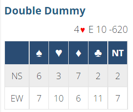 Konklusjonen er atlså at maksimalresultatet på dette spillet - i teorien - er +620 for utgang på 4-2 tilpasning!