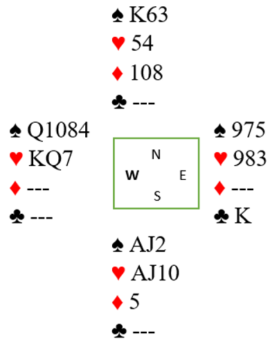 Du stikker utspillet med kløver ess og spiller kløver til trumf med det samme. Trumf gjerne høyt, du har jo på en måte like store rutere hos blindemann. Så trumf til nord og nok en kløverstjeling, gjerne høyt igjen. Begge motspillerne følger farge i første ruterrunde. Så følger en andre runde trumf til bordet, og nords siste kløver trumfes. Dette er igjen: