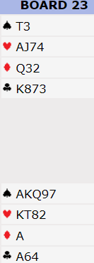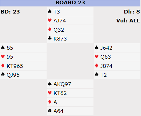 I lagturneringen NZ TEAMS som undertegnede deltar i denne uken er det et par kamper igjen før det blir utslagskamper for de 16 beste lagene helt frem til lørdag. I den siste kampen tirsdag kom en haug med vanvittige fordelinger med slemspill, slem og utgang begge retninger, og en enorm omsetning i nesten alle kamper. Her er et spill, en marginal, men ganske bra slem: