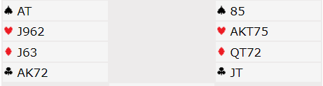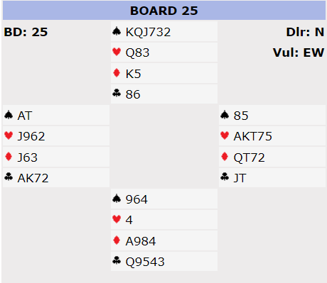 N/S var passive. De poengene N/S har antagelig er fordelt noe sånt som 12-13 (N/S) og 7-8 (S) som gjør det litt mer sannsynlig at nord har hjerter dame. Ũden annen side har nord fem eller seks spar, syd kun tre eller fire, og det gjør det ikke mest sannsynlig at nord har hjerterlengde. Hvis syd har singel hjerter ville han kanskje meldt mer hvis han har fire spar? Og hvis nord har sekskorts spar kunne vel han godt ha konkurrert mer, til tre-trinnet (paret bruker ikke 3 spar som invitt i den situasjonen, etter 1S-2S)?