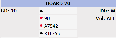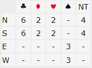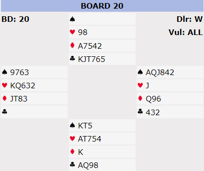 Ved bodet spilte syd ut hjerter ess og skiftet til en trumf som nok må være feil motspill da han kan se hjerterne som vil gi ruteravkast hos øst. Etter trumfkift var det ingen problemer, to rutere forsvant på hjerter, og østs to små kløver ble stjålet. N/S fikk kun ett stikk i hver rødfarge og for trumfkongen, elleve stikk og +620 til N/S.
