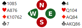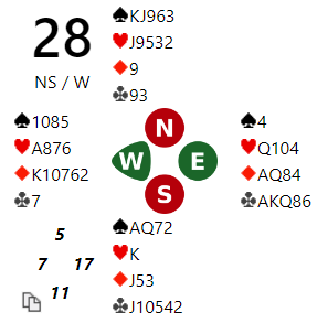 Det er normalt nok med utgang her med disse 24 honnørpoengene til sammen, men det er en ganske bra slem som står veldig ofte om kløveren sitter 4-3. I så fall gir den fargen to hjerteravkast for kløverhonnørene, og den femte kløveren kan godspilles med en stjeling og gi ett avkast til. Dermed kan det bli kun en spartaper. Kløveren satt imidlertid 5-2, men slem vinnes fort likevel siden hele spillet så slik ut: