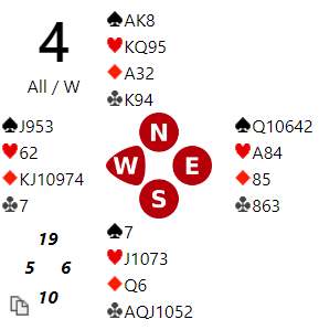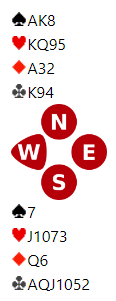 Tirsdag kveld var det klubbkveld i Fredrikstad BK med Tone Annette Olsen som makker. Da satt jeg flere ganger med sterke kort og gode majorfarger. Mye moro ut av det siden makker hadde litt tilpasning for å vinne de fleste kontraktene våre. Her spill 5 der jeg (N) var giver i ugunstig sone.