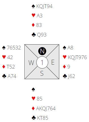 //I 4 spar går det fint. Trumfesset presses ut. Nord har akkurat nok trumf til å ta ut alle vests trumf selv om han blir kortet med mer hjerter fra forsvaret. Det blir faktisk feil motspill å korte nord i trumf, for da står resten pga. alle de ruterstikkene. Beste motspill i sparkontrakt er å ta hjerterstikket og skifte til kløver til esset for å holde kontrakten på ti stikk. Det motspillet bør antagelig finnes, for øst ser jo syds ruterfarge på bordet//
