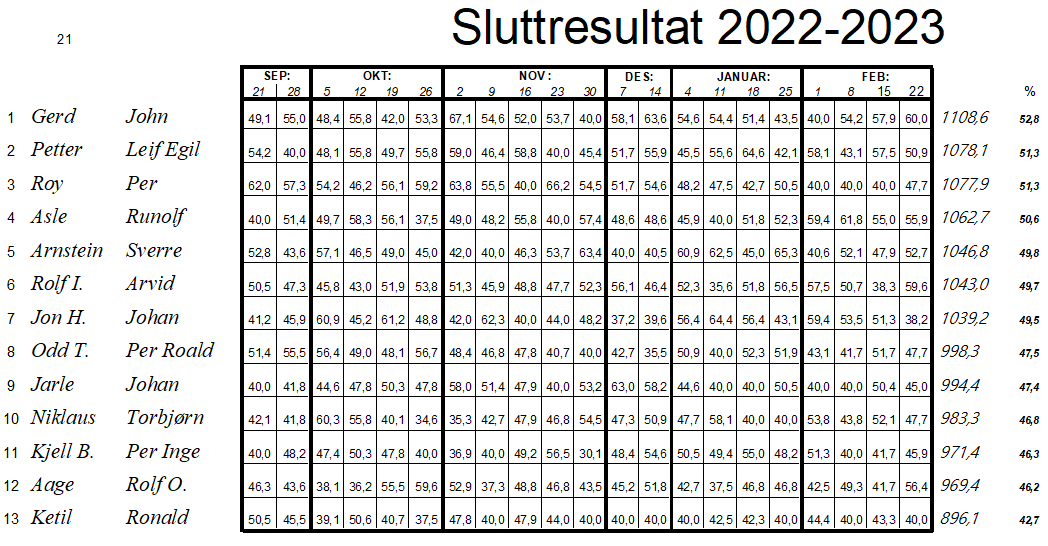 Det ble spilt simultanturnering og det møtte 11 par. Det ble hard kamp om seieren. Den gikk til Sigurd og marius med hele76,2% tett fulgt av Svein B. og Asbjørn med hele 75,0%. Siste par på pallen ble Ove og Egil med 52,8%. Det var bare disse tre parene som kom over middels i kveld.