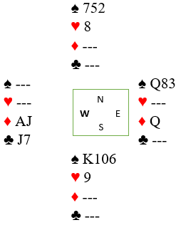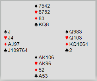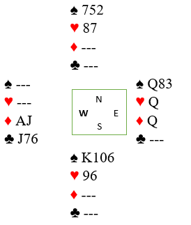 Du har som øst åpnet med 1 hjerter etter pass fra nord. Syd meldte inn 2 ruter. Makker viste hjerterstøtte og minst 10 poeng, og nord støttet ruteren. Da jeg var i 4 hjerter, tenkte syd lenge før han endelig passet og det gikk pass rundt. Hva tenkte syd på? Syd var en meget rutinert spiller, og dette var tross alt i A-finalen i parturneringen.