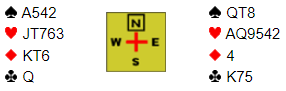 Her et artig spill hvor man kan stusse på hvordan det gikk til at utgangen 4 hjerter ble vunnet. Det ble to bet i samme kontrakt ved det andre bordet.