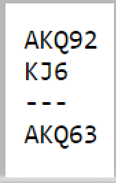Hvis nord prøver seg med Exclusion med disse kortene får han 0 nøkkelkort i fargene spar, hjerter og kløver. Da avslutter nord med 6 spar. Slik så hele spillet ut: