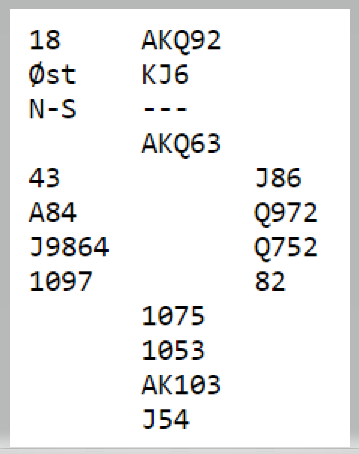 Øst er giver og N/S i sonen. Du sitter nord med disse fine kortene: