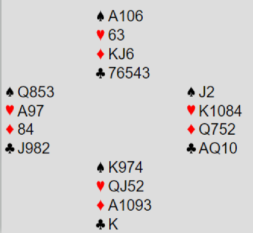 Så vest må spille kløver. Da kan spillefører gratis prøve tieren. Slik det satt vinner kløver 10 stikk, og to hjertere forsvinner fra syd på kløverstikkene. Tolv stikk uten å måtte gjette i hjerter. '