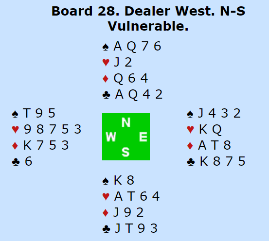Ved begge bord åpnet nord med 1NT. Syd meldte Stayman 2 kløver, og over nords 2 spar avsluttet syd meldingene med 3NT.