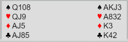 Ved det andre bordet ble 6NT spilt av øst. Der valgte syd et brutalt utspill, kløver 10! Det kunne vært kostbart om nord ikke hadde hatt nieren, men her ødela det i hvert fall ikke forsvarets kløverbeholdning. Spillefører prøvde knekten, nord la damen og øst kongen. Nå gjettet spillefører riktig da han spilte hjerter mot Q-J-9. Syd la kongen, og da ble det enkelt tre hjerterstikk uten å måtte gjette noe i den fargen. Med 4+3+2+2 = 11 sikre var det deretter bare om å gjøre å ikke tro på noen skvisvariant, og heller ta ruterfinesse. Det ble hva DYSON sin spillefører gjordehelt til slutt, og med tre ruterstikk ble det +1440 og 17 IMP inn. Etter det settet ledet DYSON med 10 IMP.