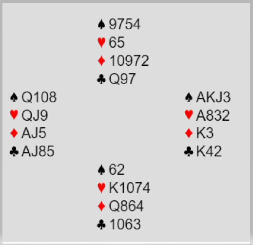 PLACETT sin spillefører stakk hos vest og spilte hjerter dame. Den gikk rundt til Erik Berg (syd) sin konge, og derfra kom mer spar. Nå var det mange muligheter, men hjerteren satt ikke som han håpet, og det ble en bet siden hele spillet så slik ut: