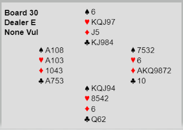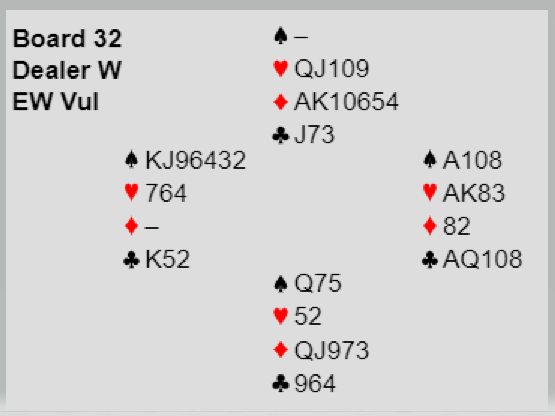 Forsvaret har fire toppstikk, men det er kun -300 som i så fall er vunnet spill med lagkameratenes +430 . Men siden øst hadde singel kløver kunne de også få seg en stjeling med østs single trumf. Det motspillet ble funnet, og det var +500 til Plackett, 2 IMP. Dermed ledet de med akkurat 2 IMP før det siste spillet. Kampen ville altså vært avgjort med uavgjort i spill nr. 32. Det spillet så slik ut: