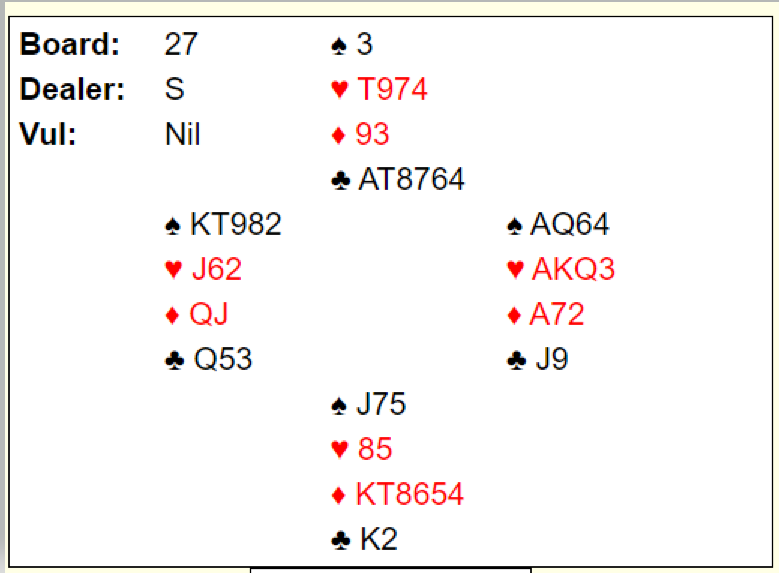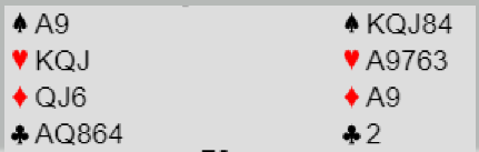 Syd spilte etter disse meldingene spar ut mot 3NT, Som du ser er det elleve sikre stikk i sparkontrakt. Der tas simpelthen trumfen ut i tre runder så spilles hjerter med avkast for en ruter i fjerde hjerterrunde. N/S får kun to kløverstikk. Det eneste som kan true spilleførers overstikk i 4 spar er kløver konge i utspill, kløver til esset og mer kløver. Skjer det må spillefører gjette riktig å trumfe høyt, så sparhonnør fra øst og spar til finesse. Men det problmet fikk ingen, og alle som spilte sparkontrakt fikk elleve stikk.