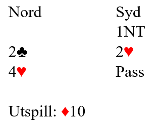 Syds grandåpning viste 15-17. Etter Stayman 2 kløver fra nord havnet de i 4 hjerter, og du er godt fornøyd med at makker fant ruter i utspill. I slik tilfeller er det opplagt å stikke over tieren, ikke legge styrke. Det kan bli temmelig dumt å legge ruter 2 som styrke om den utspilte tieren er en singelton! Da blir du antagelig sittende å se på de der ruterstikkene resten av spillet, men du får ikke stikk for dem. Så du stikker over og fortsetter med stor ruter, makker følger med nieren. Du prøver en tredje runde ruter og er fornøyd med at den også gir stikk, makkers utspill var fra 10-9 dobbelton. Tre stikk til forsvaret, men hva nå?