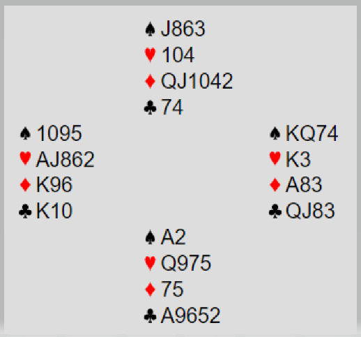 Spillefører var inne hos øst i fjerde kløverrunde. Han trengte ett ekstra stikk i spar eller hjerter. Han valgte å satse på sparen og spilte den lille hjerteren til esset og spar mot øst. Nå kunne han tatt sparfinessen, men er det så opplagt når du sitter ved bordet og ikke aner sitsen? Hvis han tipper sparen blir det kun to kløverstikk, spar ess og det ruterstikket de fikk i første stikk (=4 totalt) til forsvaret.
