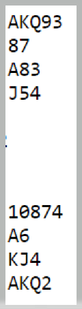 Atle fikk vist 15-17 grandhånd med 5 kort i spar, hj A men ikke ru A! På 5- ess Blackwood 2 ess men ikke sp KD og da Flemming viste sterk hånd var nok 7 kløver forslag til å preferere i sort farge. Sp K mangler jo men sitter den i Øst vil 4 kort spar der gi sikker taper i 7 spar men det ble unngått: