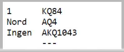 På hans hånd. Ergo la jeg bare ispJi 2. stikkog den holt. På sp Aog K fulgte Terje med sp D og 10 og trumfen var ute.Så liten hjerter, lavt fra Magnar og jeg prøvde med hj J fra blindemann som droesset. Ny ruterkunne jeg trumfe, spille hjeter til kongen og stjelenok en hjerter, men da viste det seg atØst bare hadde hatt singel ess i hjerter. Det gjensto å ta finesse i kløver som nok måtte gå feil trodde jeg, men da kl D vant neste stikk hadde jeg resten og vi fikk +4 for det. Haug hadde sp D105- hj A- ru AJ109872- kl J6.der jeg var giver og ingen i faresonen. Min hånd: