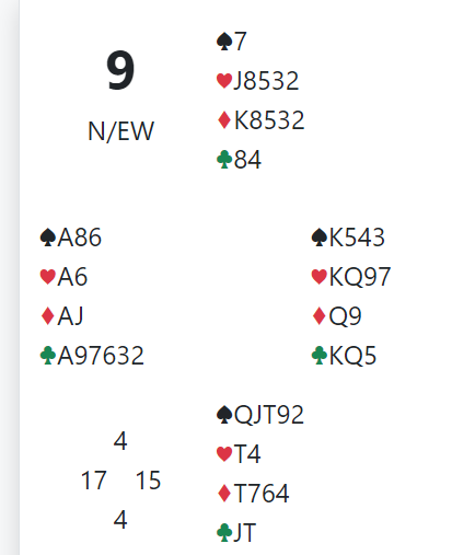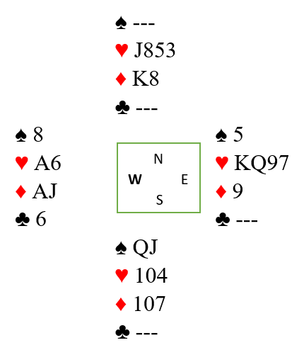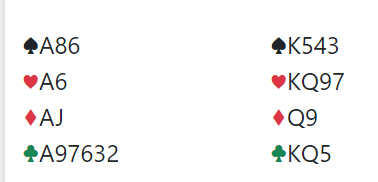 Ved det andre bordet var Rubbestadnesets N/S også i 6 hjerter og fikk ruter ut. Der ble det spilt hjerter til esset og hjerter til kongen for så å ta kløverstikk med avkast av ruter og spar fra syd. Men da ble det en bet siden hele spillet så slik ut: