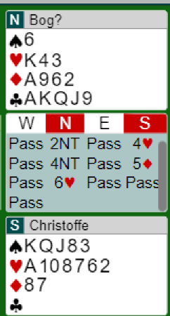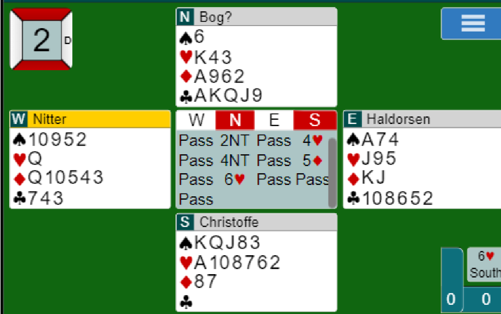 Makker meldte da 4 NT som trolig var ment kvantitativ, jeg bør passe med mim (ca 14-15) men gå mot slem med mere. Usikker valgte jeg å svare 5 hjerter og Terje la da på til 6 NT som det gikk pass rundt på.