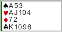 Pass fra Øst (motstandere var brødrene Bang) og jeg hadde jevn hånd med 3-3-3-4 og 16 hp og kunne bare meldt 2 kløver for å få mer greie på makkers beholdning. Men mot ordinør styrke i Nord har jeg jo nok til utgang (+) med gode hold ihj, ru og kl og valgte å hoppe til 3 NT. Hånden min var slik: