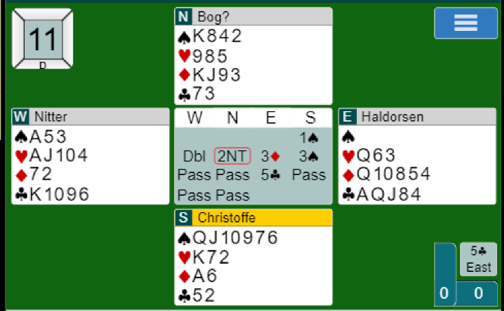 Trond Are Nitter (Rubbestadneset) doblet etter 1 spar fra syd. Og joda, makkeren Rune Wichmann Haldorsen meldte ruter, men han hadde til nok en melding senere, og det ble en gullmelding: 5 kløver!