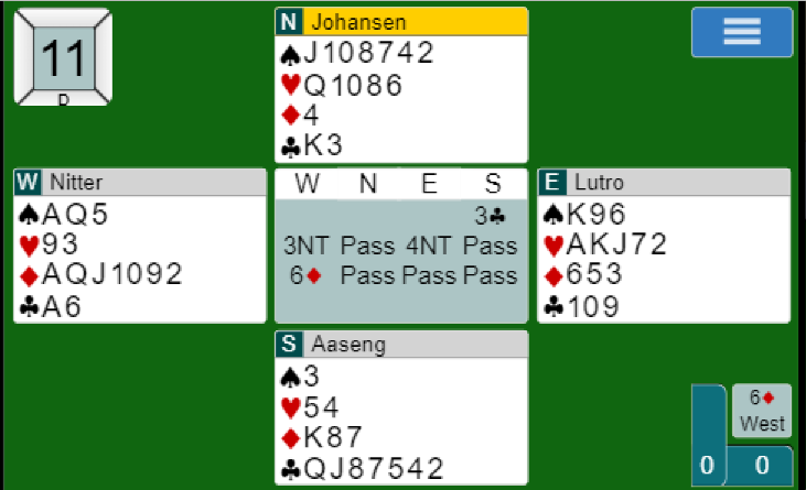 Joda, N/S hadde utgang. Det stod faktisk i 6 kløver slik det satt. Men 5 kløver er nok og godt meldt om man kommer seg dit. Merk at 5 kløver godt kan gå bet om det er kløvertaper. Hvis de tar ett stikk i hjerter og skifter til spar er det fare på ferde. Siden kløver ordner seg og ruteren ikke sitter 5-1 blir det tolv stikk, ruterfargen gir avkat for tre spar hos nord. Om kløver sitter 3-1 må spillefører - om motparten har skiftet til spar i andre stikk - spille ruter etter to store trumf og håpe at den med trumfstikket følger fire ganger ruter så den femte kan spilles med sparavkast før de får stjålet seg inn og tatt sparstikket.