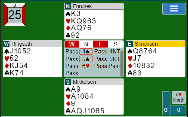 Friskt meldt og bra spilt av Nitter, og spillet ga 10 IMP til Rubbestadneset siden TopBridge spilte utgang ved det andre bordet. Medaljekampen er dermed ikke over idet andre halvrunde skal spilles om litt!