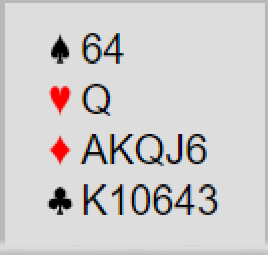 Den andre situasjonen du kan ta stilling til er at etter vests 1 hjerter går det pass fra nord og 3 hjerter (sperr) fra øst. Hva melder du da?