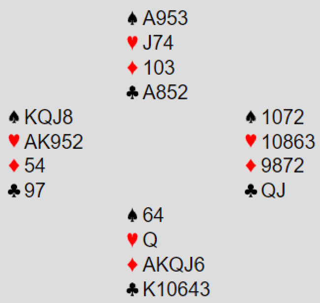 TopBridge sitt N/S-par meldte korrekt til 6 hjerter vel vitende om at det måtte en vellykket kløverfinesse til for å vinne tretten stikk. (Nord ville meldt 6 kløver over 5NT med kløver konge) Storeslem står på kløver konges plassering, i praksis en 50% sjanse. Da Studentenes BK sitt N/S-par satset på storeslem og gikk bet slik det satt var det 14 IMP til Topbridge.