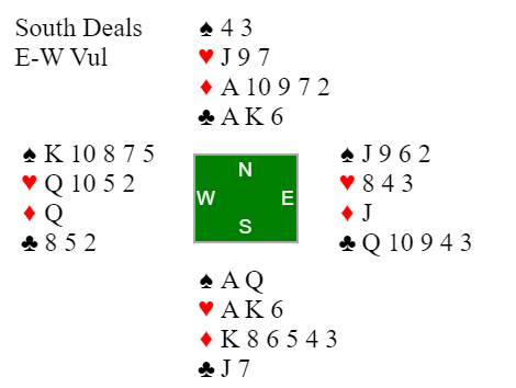 Normalt vil en slik 3NT gå bet med kun en hjerterstopper, for N/S godspiller hjerteren og spillefører har kun syv toppstikk i kløver og hjerter samt ruter ess. Han må innom motparten. Så med hjerter 5-3 kunne de ha sørget for å ha overgang til syd i den fargen, og om syd har spar ess er det håpløst, syd kommer inn til hjerterstikkene sine. Men her satt hjerteren 6-2, og syd hadde ikke noe hurtig inntak. Det er faktisk slik at om spillefører gjetter sparen (knektens plassering) så kan ikke 3NT rokkes!