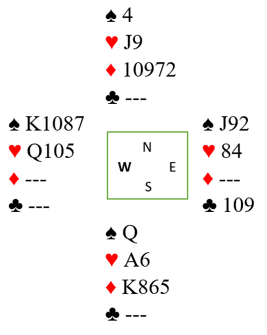 Siste runde på Sarpsborg BK sin sommerbridge 6. juli. Vi møter ekteparet Mikkelsen og 4 par er i tetgruppen. Så her står det om heder og ære. Og fete premier. Du plukker opp en hånd i vest som sikkert de fleste må lure litt på "hva nå".