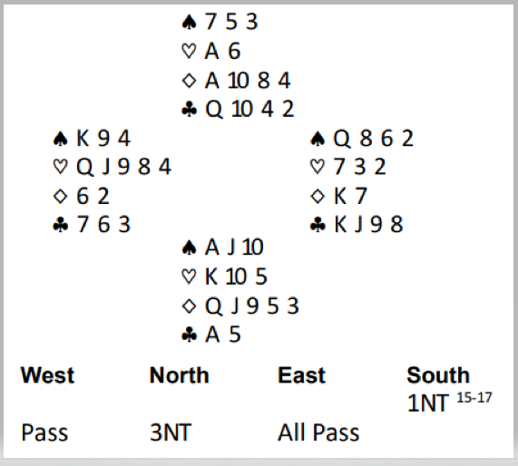 I en lagkamp kom begge sydspillerne i 3NT etter 1NT-3NT, og ved begge bord kom hjerter dame i utspill fra vest. Hvordan ville du spilt denne utgangen?