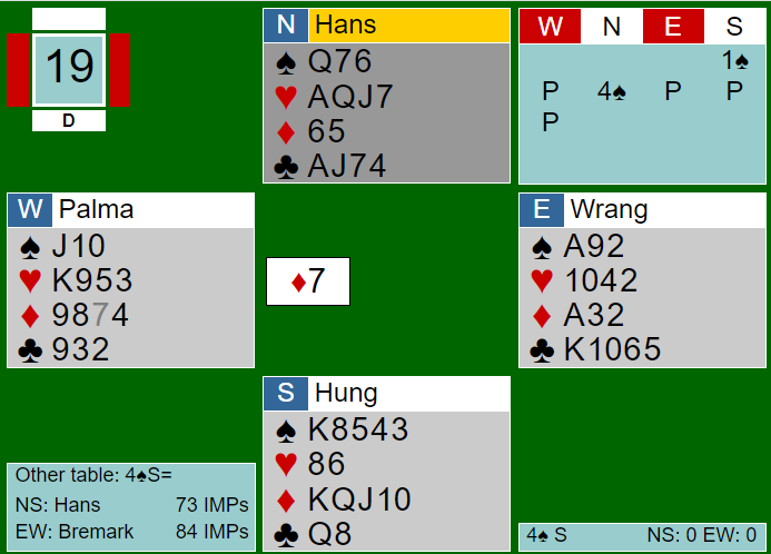 Ved det andre bordet var ikke øst så optimistisk og BREMARK sitt Ø/V par stoppet i 6 spar. Dermed ga spillet 14 IMP til vinnerlaget.
