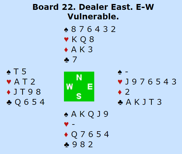 Øst doblet slemmen i håp om to kløverstikk, en Ligthnerdobling for å unngå hjerterutspill (doblingen ber om unaturlig utspill, og hjerter ut er det mest naturlig slik meldingene har gått). Men Ø/V har kun ett kløverstikk, så slemmen står uansett. Vest visste ikke om det skulle kløver eller ruter ut og valgte ruter knekt. Da ble det tretten stikk, (nesten) claim i stikk en. Det var bare å ta ut trumfen, stjele god ruteren, stjele en hjerter og ta for den femte ruteren med kløveravast. Så kryss-stjeling. Dette festspillet ga det norske paret +1310 som normalt er en topp. Det ga dog "bare" 95 % da ett par til hadde samme score, og det var også et par som noterte +1770 for 7 spar doblet med hjemgang!