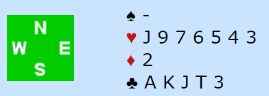Velegnet for opplysende dobling men singelton i ruter er ikke gunstig siden makker normalt vil svare der. Derfor nøyde Nord seg med å melde 1 hjerter, Jan P. hadde sp A74- hj J5- ru K963- kl D862 og valgte å støtte makker mer bud 2 ruter. Eva var svak, men brukbar sparfarge med 6 kort ble likevel introdusert, og da Gerd nå meldte 3 hjerter klarte Eriksen å løfte til 4 hjerter. Hun hadde: