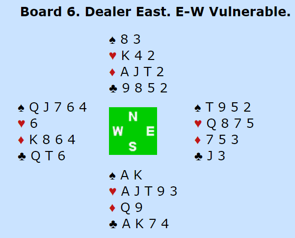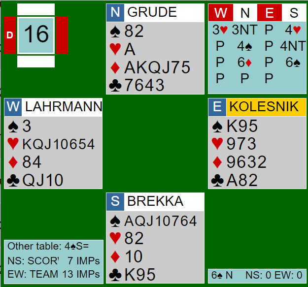 Som du ser havnet Brekka og Grude i 6 spar etter sperreåpningen 3 hjerter fra vest. Det er ikke lett å melde når det starter så høyt, og slemmen de havnet i er temmelig hard. Dessuten kom den tilfeldigvis på en måte på feil hånd (nord), men det spilte ingen rolle siden øst hadde kløver ess.