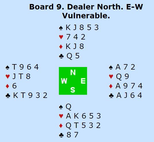 Problemet er at han ikke kan få spilt seg over og tatt nok en trumffinesse siden det i så fall ikke blir igjen noe inntak til nord. Grude spilte med oddsen da han spilte på 3-1 i trumf og satte i gang med ruteren. Det ville gått galt om trumfen hadde vært fordelt 2-2 (vest kunne da trumfet i tredje ruterrunde). Grude gikk altså på ruteren og fikk kastet både en hjerter og den siste kløveren på ruter før han kunne ta en trumffinesse til (eller bare presse med ruter), tolv stikk.